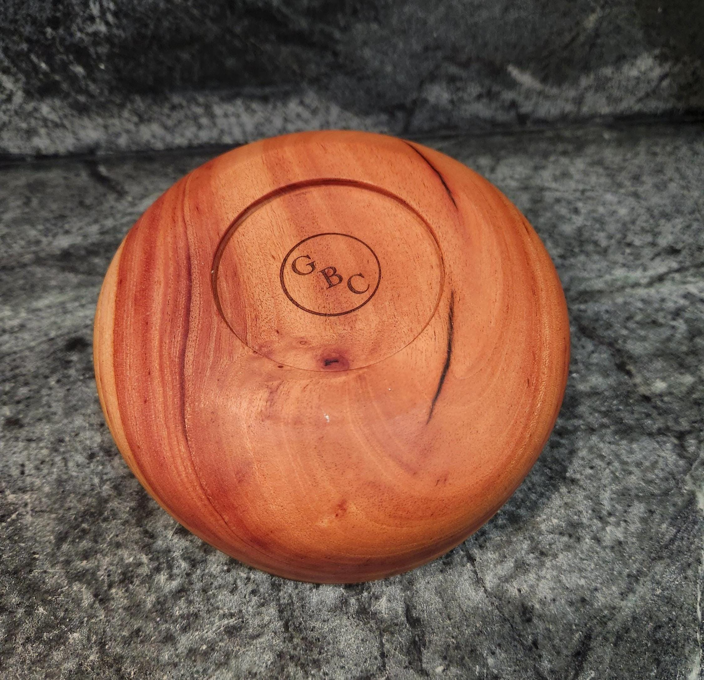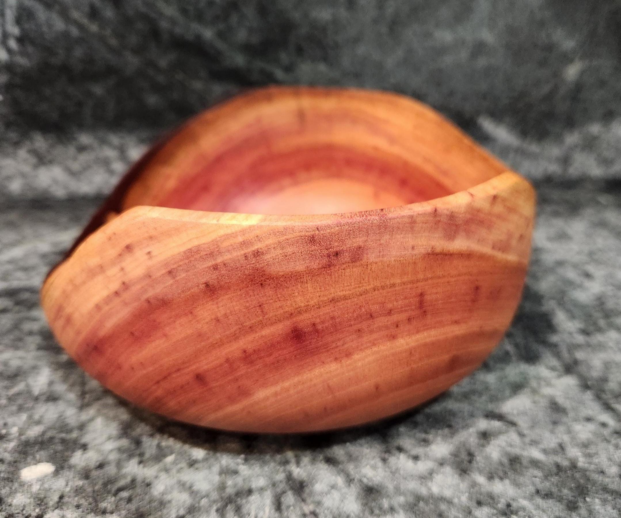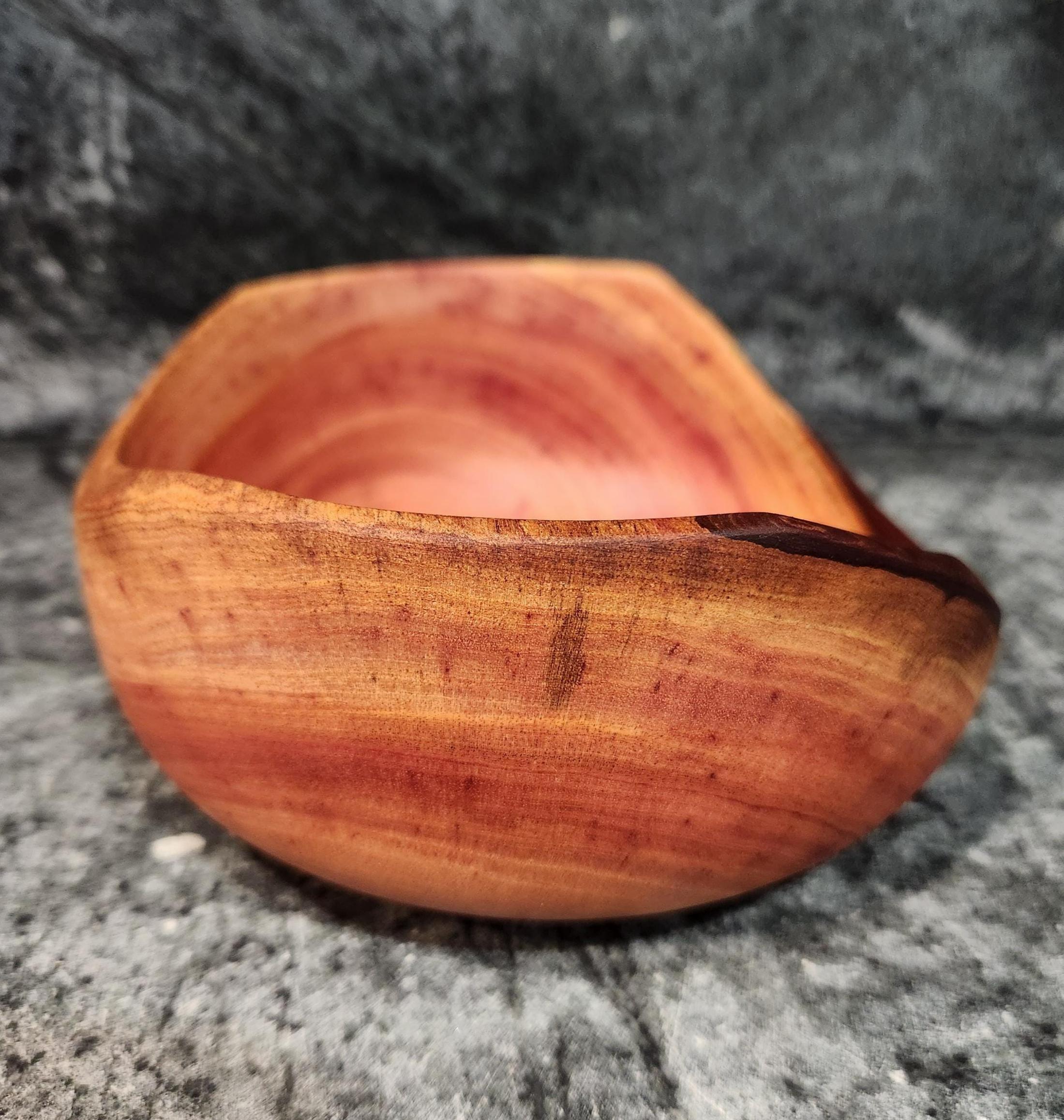 This handcrafted cedar bowl is one-of-a-kind, turned from a single piece of cedar wood. The smooth interior shows off the warm grain patterns, while the natural live edge adds a rustic and organic touch. Perfect as a centerpiece, serving bowl, or display piece, this bowl highlights the beauty of natural cedar with its rich color and unique character. Finish: Tung Oil and Bees Wax Size: 6.5 x 3 Inches 1 of 1