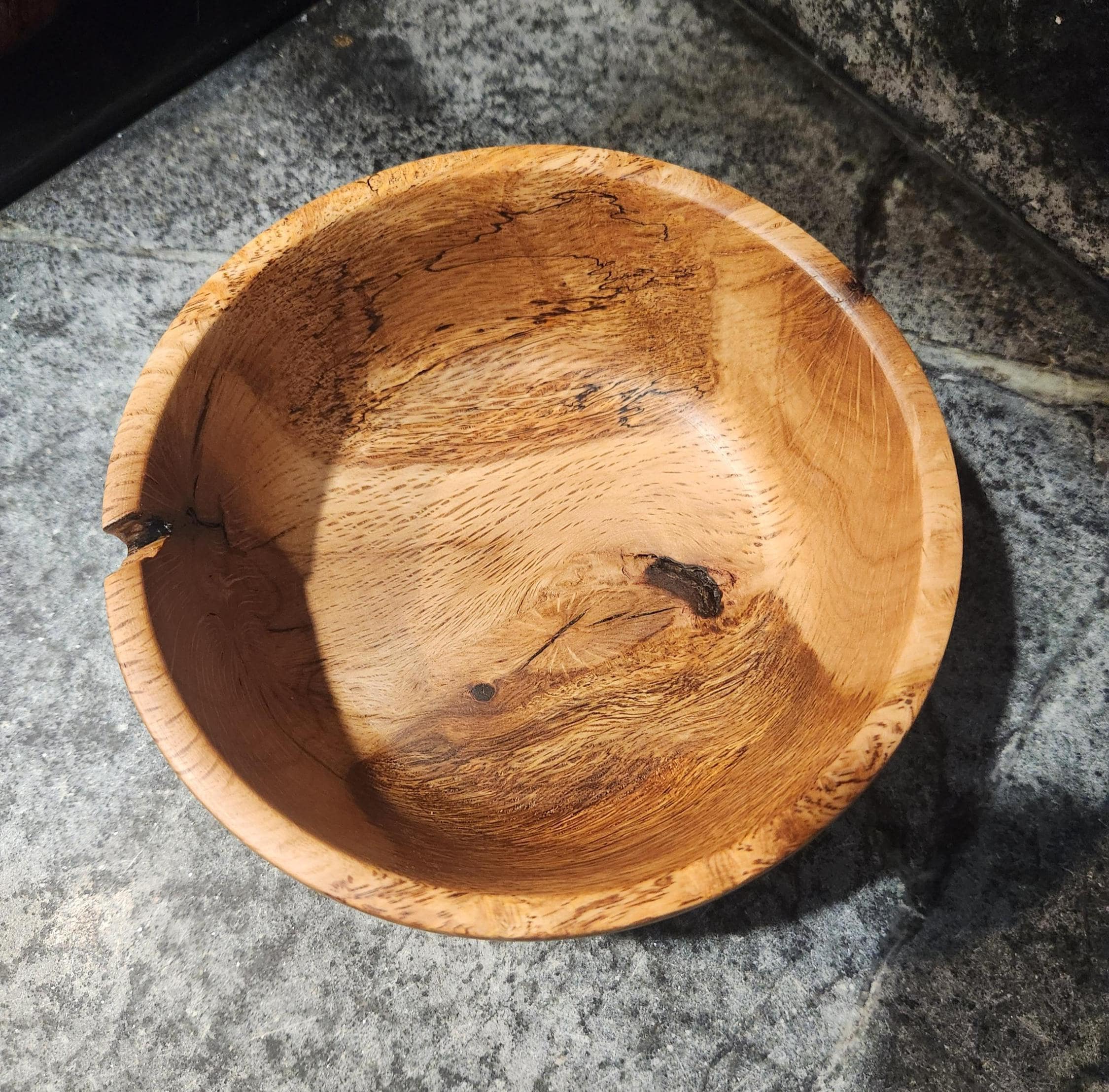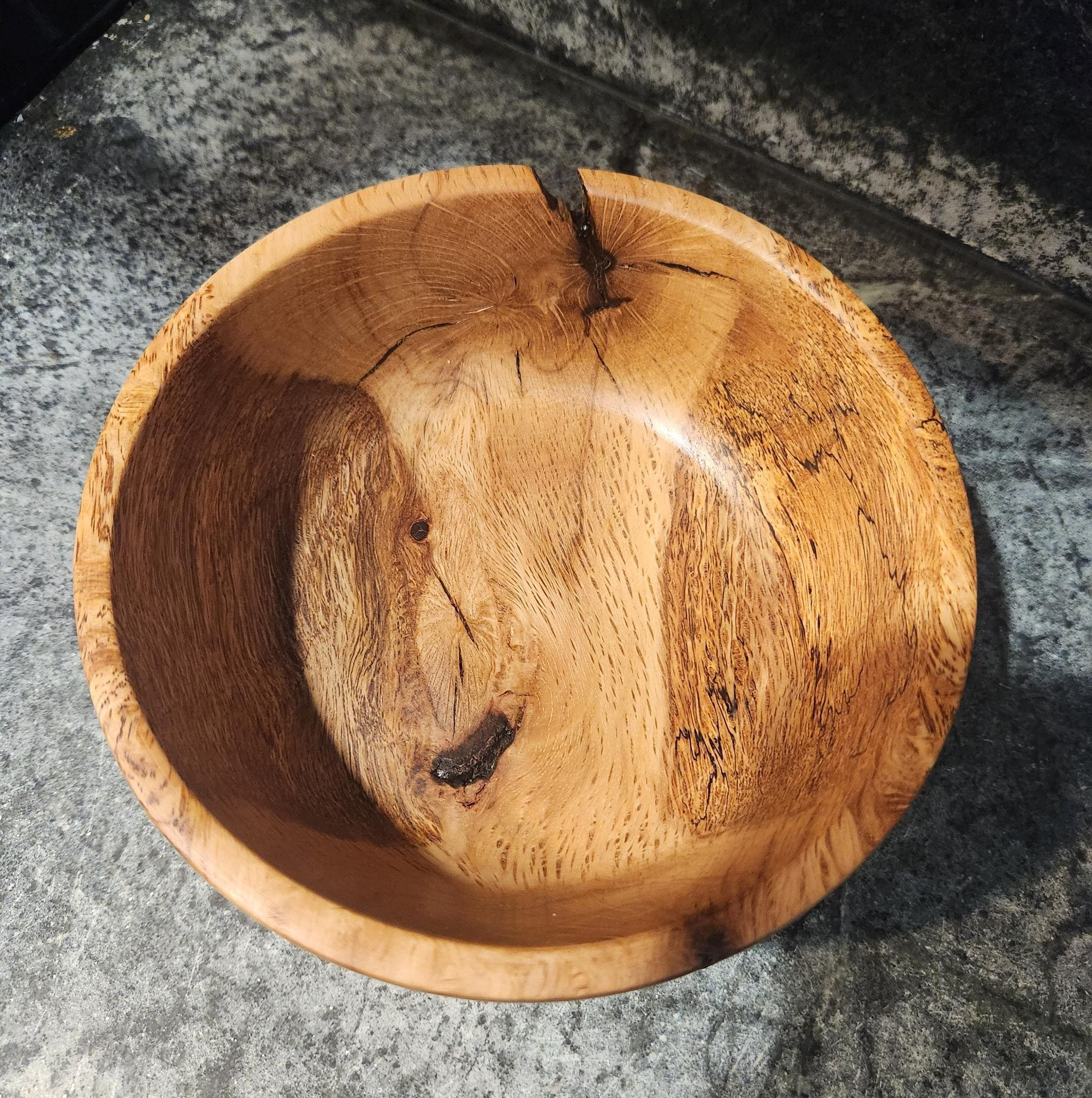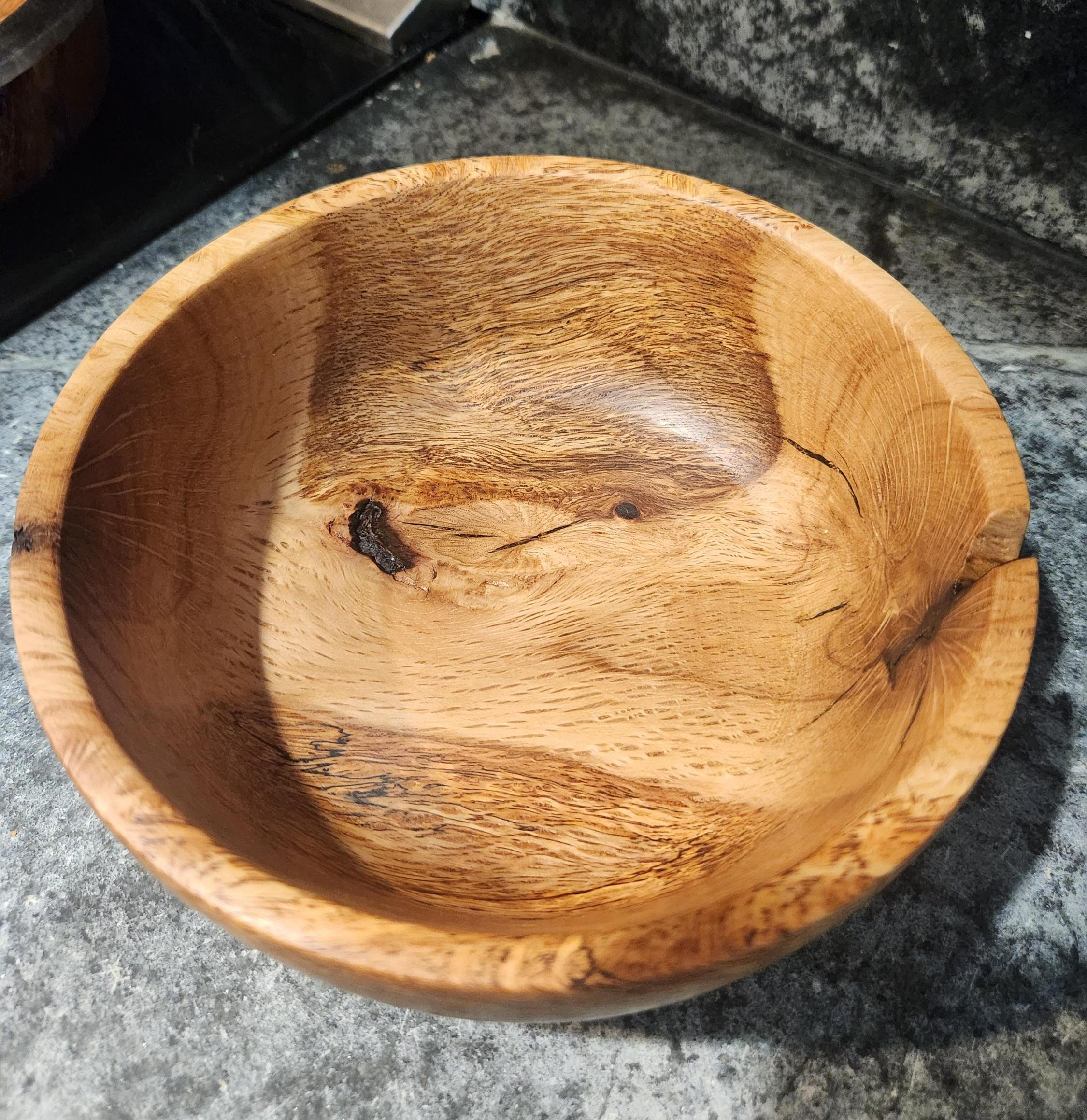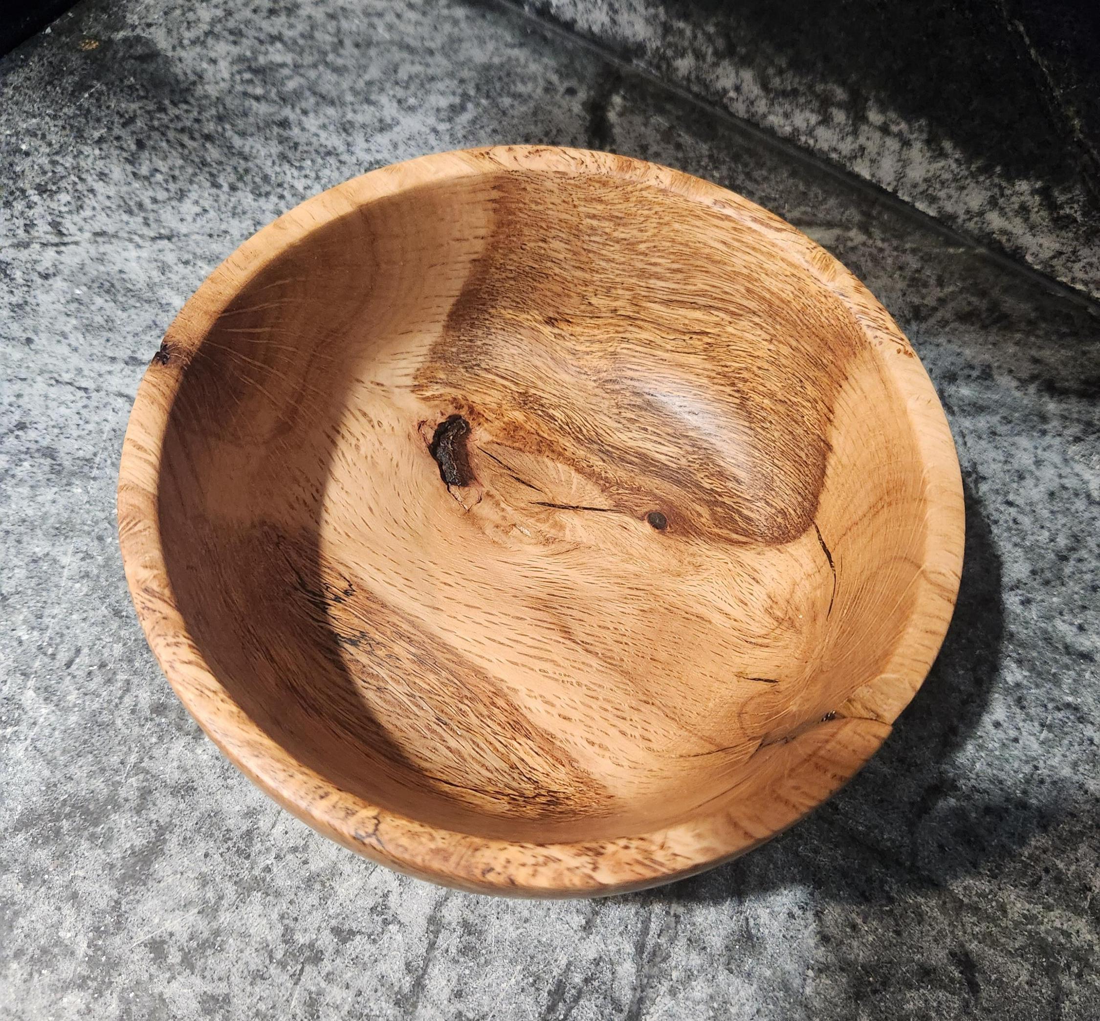 The bowl has been sanded smooth and finished with food-safe oil, highlighting the depth of the grain while preserving the wood’s natural texture. Small natural voids and character cracks are part of its charm, making this a truly one-of-a-kind creation.