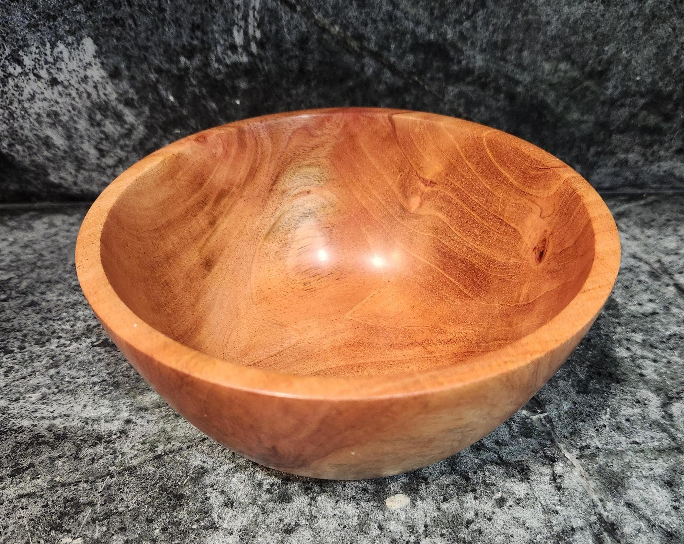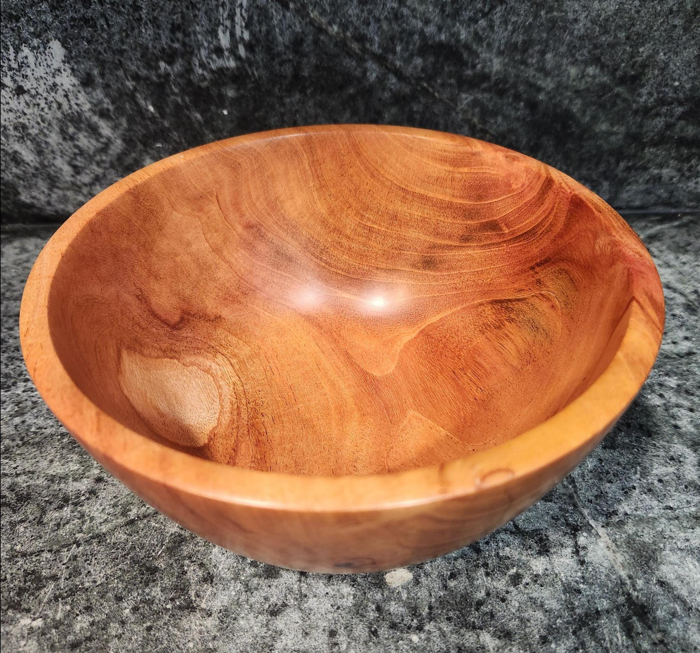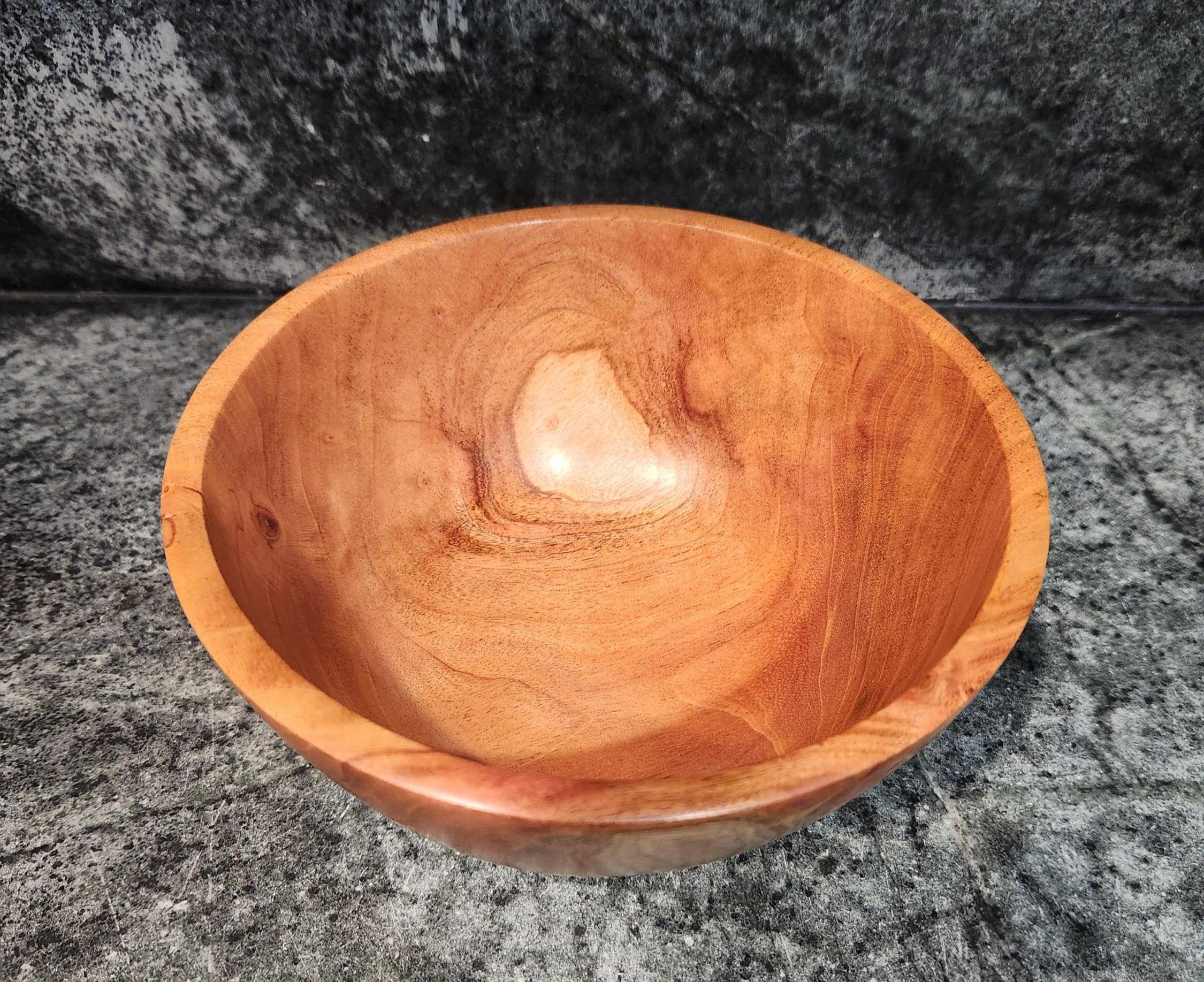 This beautifully hand-turned mahogany bowl showcases rich natural grain patterns and a warm satin finish that highlights the wood’s natural character. Carefully crafted and sanded smooth, it is perfect as a decorative centerpiece, fruit bowl, or catch-all for keys and small items.
